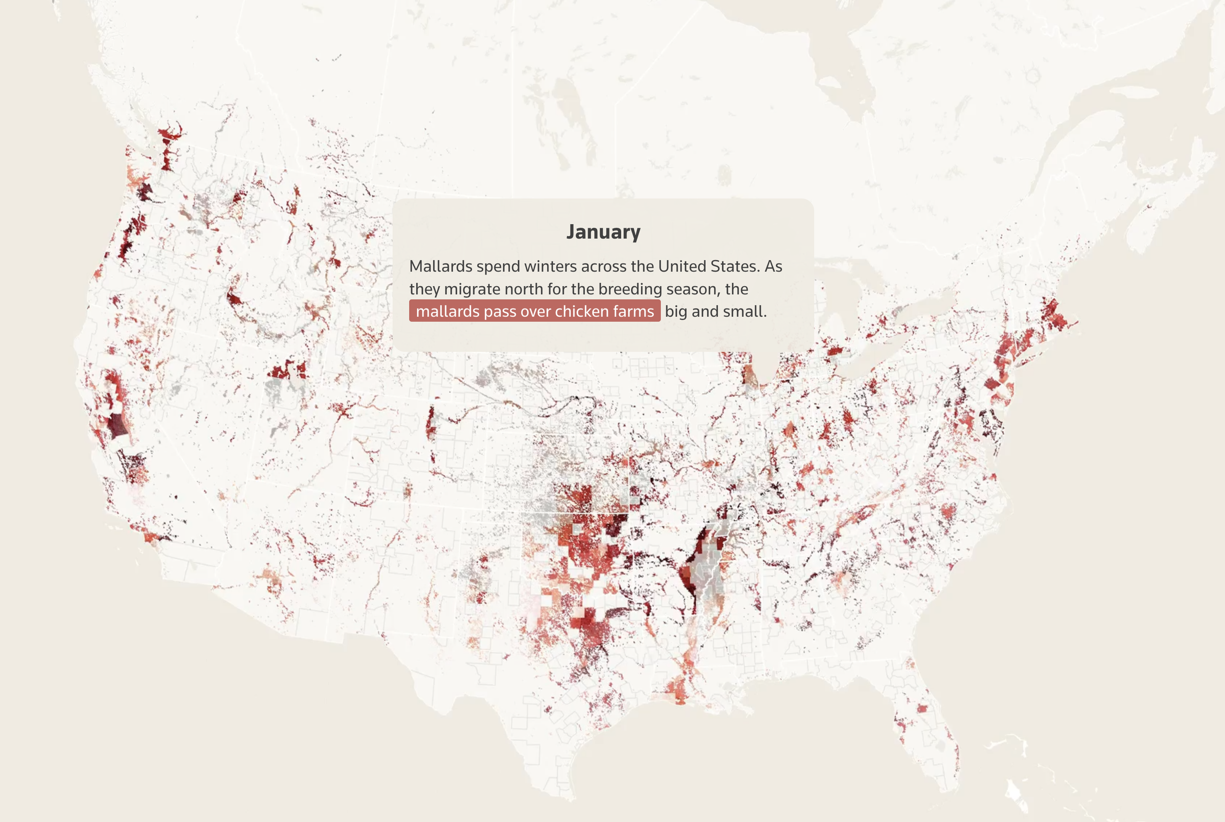 Graphics and maps I researched and produced the farm scene showing how birds can spread avian flu on a farm, bar chart of top infected birds, maps showing geographic range of top infected birds. My colleague Travis made the opening map of the U.S. and Canada that shows mallard ducks passing over chicken farms.