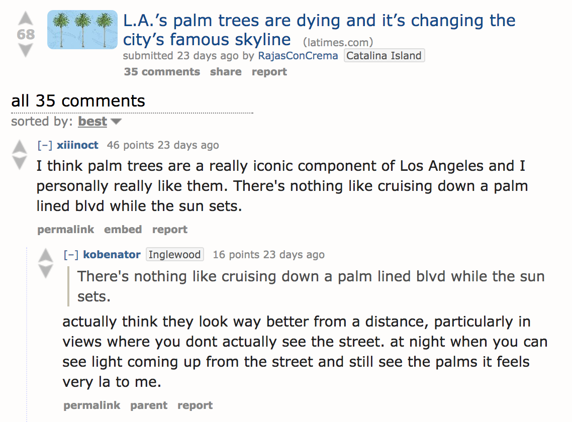 My favorite part of this story is the conversations that it started. Readers took to reddit, Facebook, Twitter and even Instagram, debating whether palm trees should stay in Los Angeles because they are iconic or die out because they have few environmental benefits.
