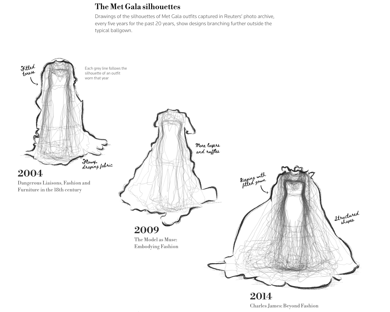 Visual concept I came up with the idea to trace Met Gala outfits over the years to see if they had indeed gotten less conventional.